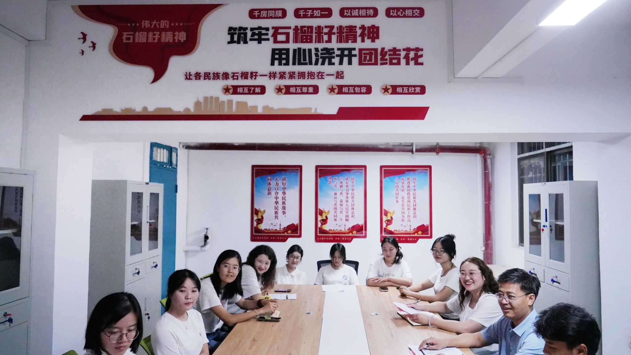 在西苑“一站式”红石榴工作站召开“铸牢中华民族共同体意识,谱写民族团结进步新篇章”民族团结进步教育座谈会,学院党委副书记曾建国、学工办成员及学院全体少数民族学生参加。