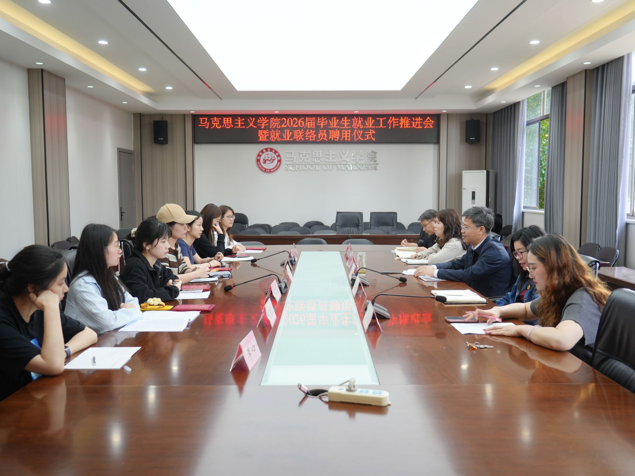在博爱楼201室举办2026届毕业生就业工作推进会暨就业联络员聘任仪式,学院党委书记曾建国,毕业年级辅导员、班主任和各班级就业联络员参加。
