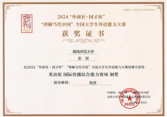 大赛由北京外国语大学主办,外语教学与研究出版社承办,高校外语界、理论界和实务界共同参与,是全国外语类比赛中颇具权威性的标志性赛事,连续多年入选教育部中国高等教育学会发布的“全国普通高等学校大学生竞赛排行榜”。此次大赛历经校赛、省赛、国赛三个赛段,来自1300多所院校的近70万学生参加。彭澍同学经过激烈角逐,最终脱颖而出,代表学校挺进国赛,并获佳绩。