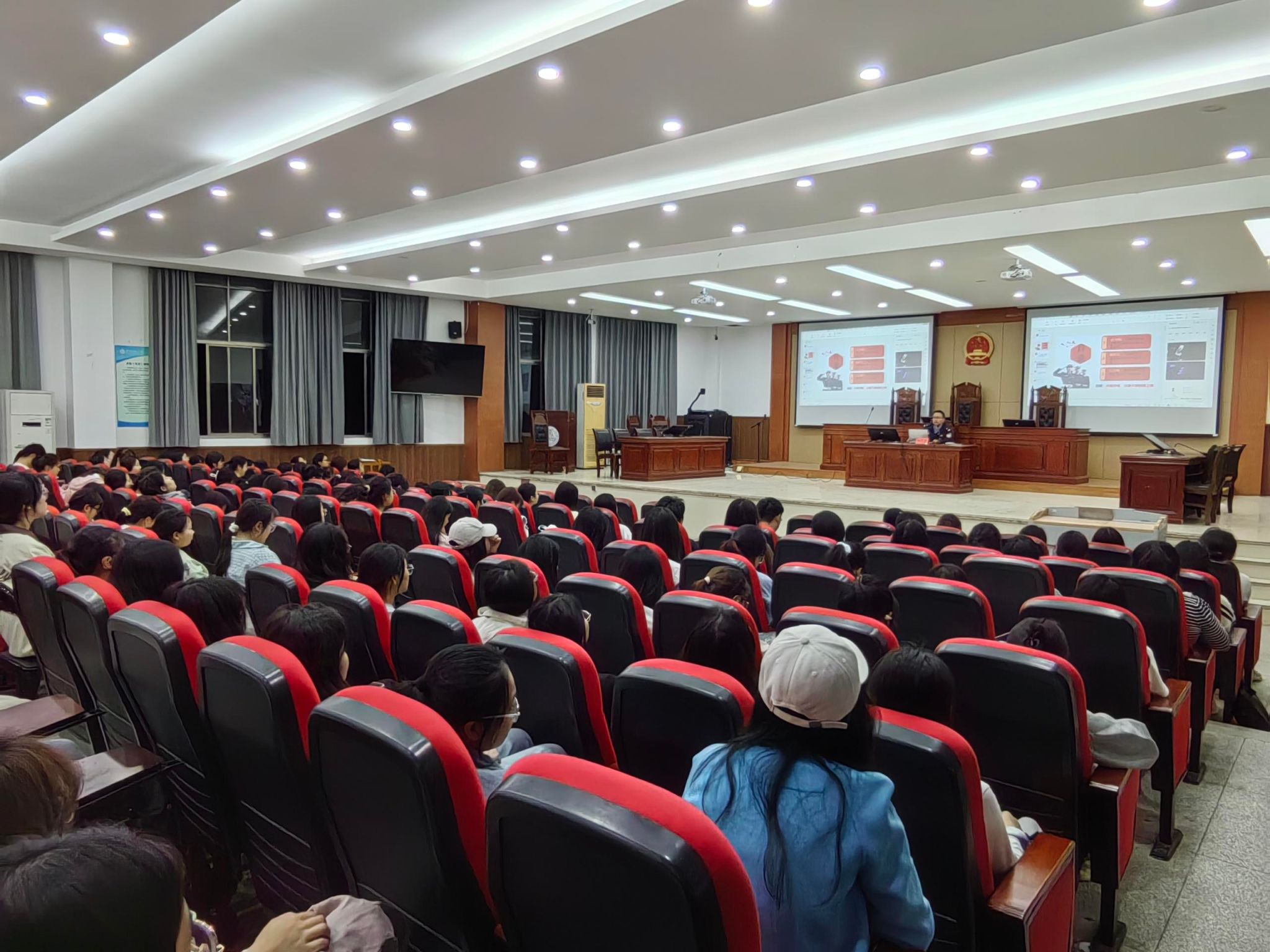 在博爱楼模拟法庭举行“同上一堂国家安全教育课”讲座,赣州市公安局蓉江分局国保大队大队长钟久伸应邀主讲,200余名师生参加。