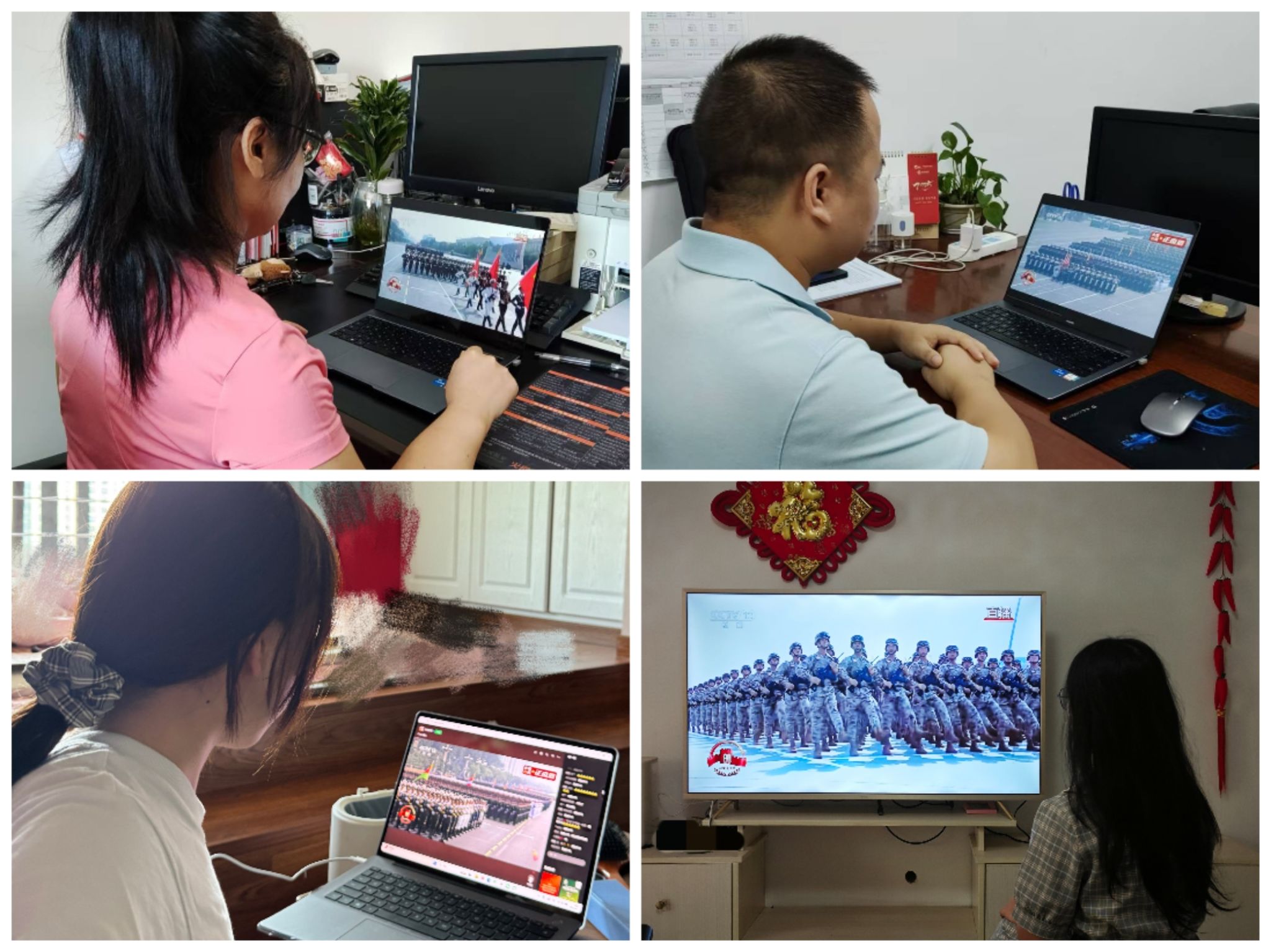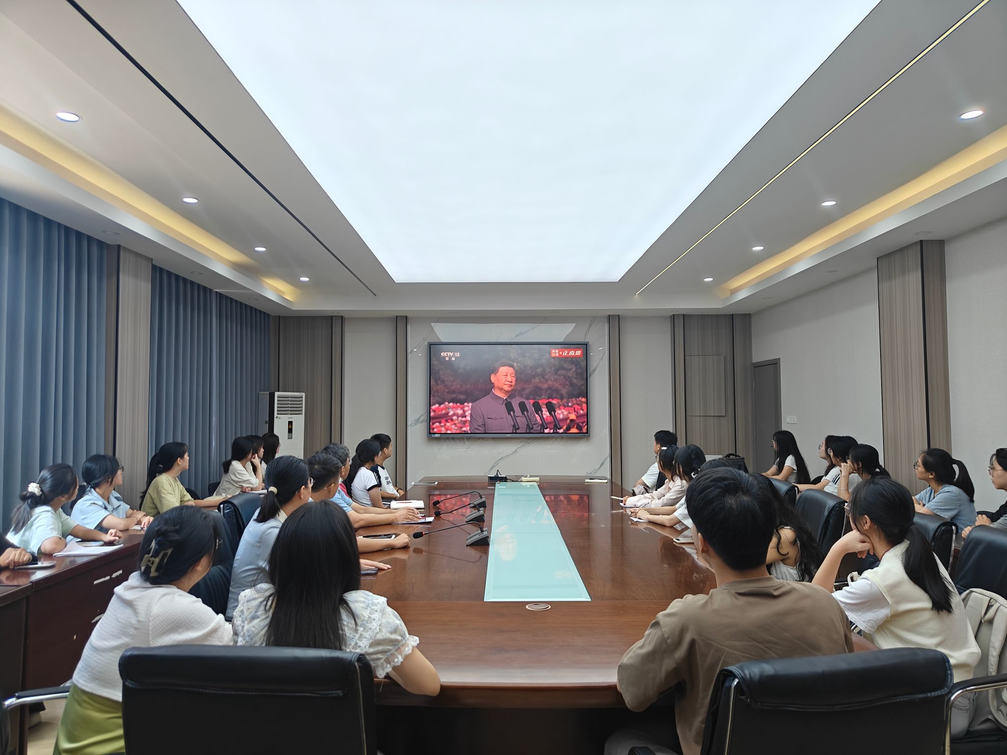 师生代表在博爱楼201室集中收看纪念中国人民抗日战争暨世界反法西斯战争胜利80周年纪念大会,学院党委负责同志、学工办成员和学生代表参加,学院其余师生通过网络平台同步收看。