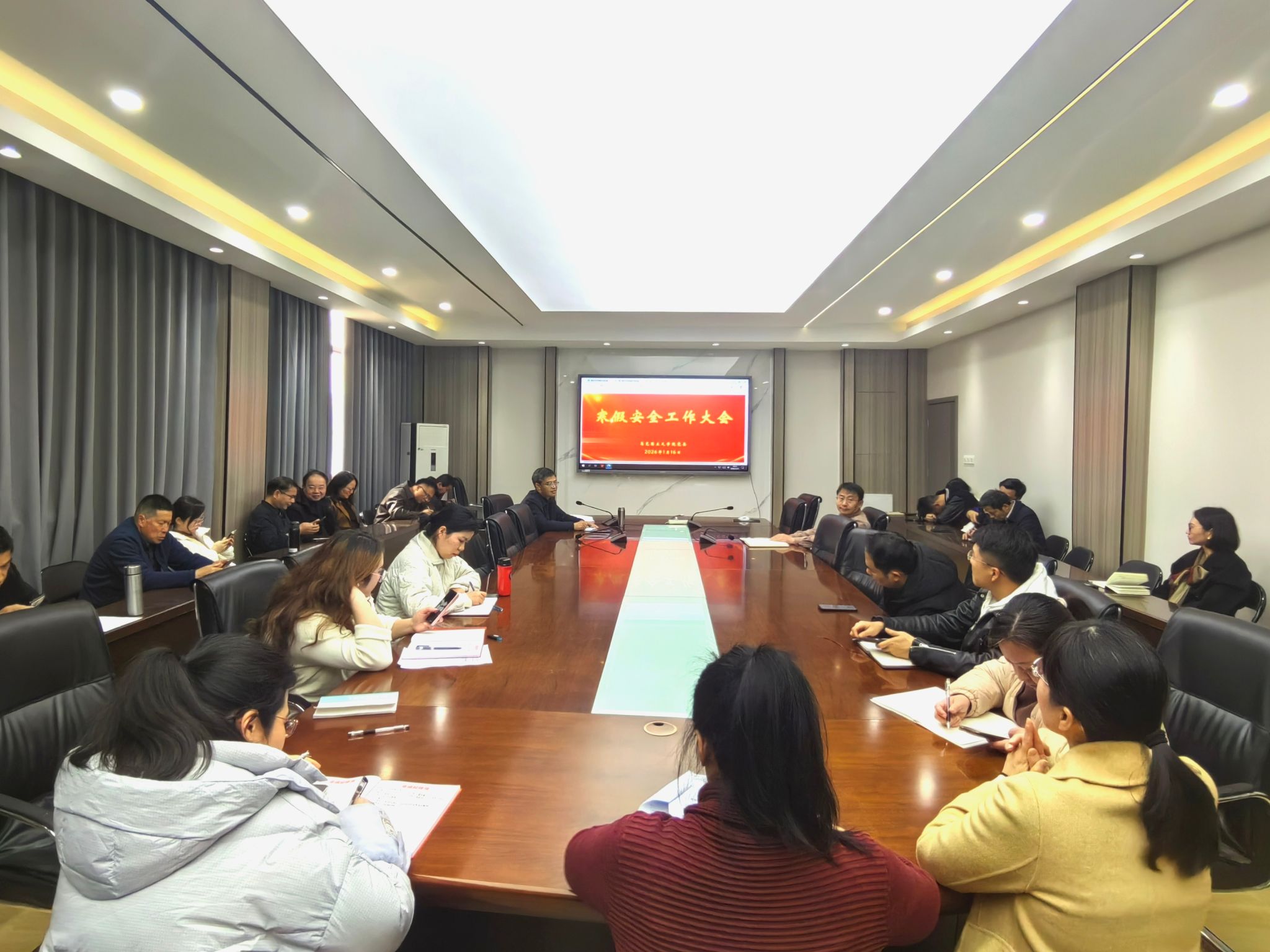 1月16日,Njavtv 在博爱楼201会议室召开寒假安全工作大会,学院全体教师和学生代表参加。