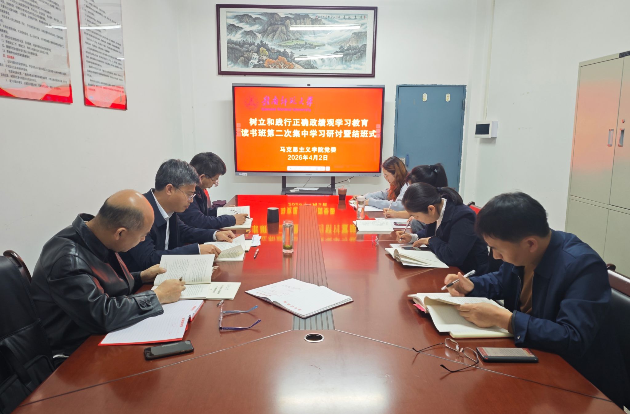 此次读书班聚焦“政绩为谁而树、树什么样的政绩、靠什么树政绩”这一根本问题,采取专家辅导、集中研讨、个人自学、视频学习相结合的方式,内容充实、节奏紧凑、学风扎实。结班式强调,全体党员干部要深化思想认识,深刻把握正确政绩观的核心要义;要立足马院使命,把正确政绩观转化为办学治院实效;要巩固拓展学习成果,以正确政绩观推动学院高质量发展,为学校以工程范式建设高水平师范大学贡献马院力量!