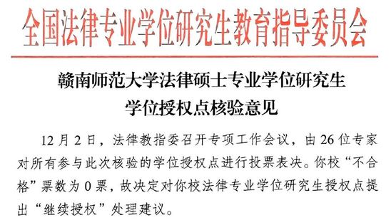 法律硕士专业学位研究生学位授权点核验意见》文件,文件指出:“12月2日,法律教指委召开专项工作会议,由26位专家对所有参与此次核验的学位授权点进行投票表决。你校‘不合格’票数为0票,故决定对你校法律专业学位研究生授权点提出‘继续授权’处理建议。”