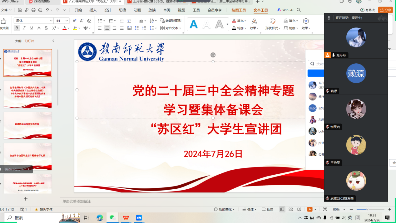7月26日,学校“苏区红”大学生宣讲团举行党的二十届三中全会精神专题学习暨集体备课会,宣讲团全体师生参加。