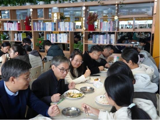 中午12时,邱小云与同学们在食堂共进午餐。“家是哪里的?”“食堂饭菜合不合口味?”“一个月生活费大概需要多少钱?”……,邱小云仔细询问同学们适应大学生活的情况,叮嘱同学们在刻苦学习的同时要加强营养,养成良好的饮食习惯,注重饮食均衡,为身体补充足够的能量,以更加饱满的状态投入大学学习生活。