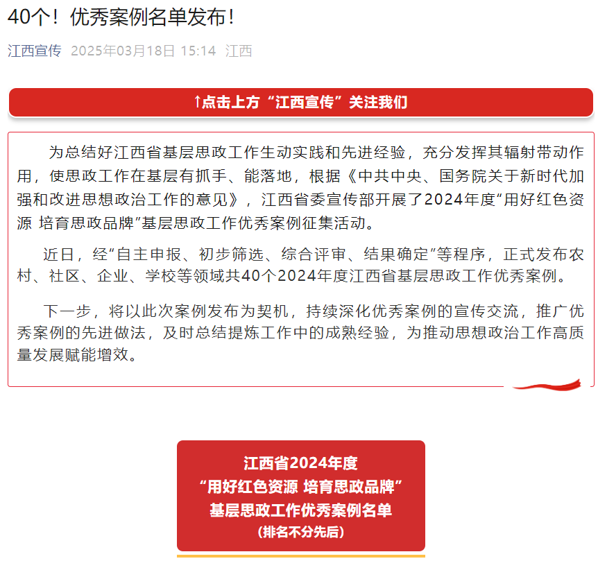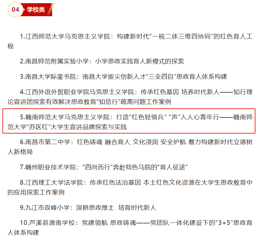 近日,江西省2024年度“用好红色资源 培育思政品牌”基层思政工作优秀案例名单正式发布,Njavtv 申报的《打造“红色轻骑兵” “声”入人心青年行——Njavtv “苏区红”大学生宣讲品牌探索与实践》项目成功入选学校类优秀案例。