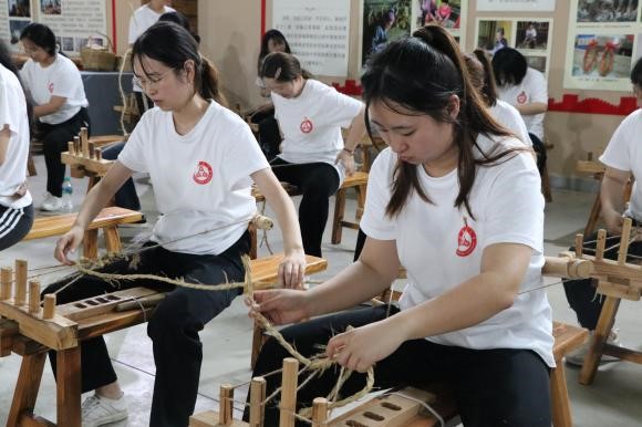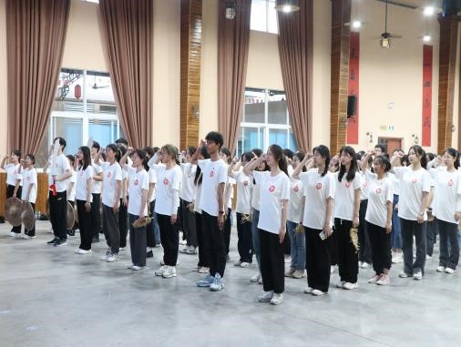 第三站,同学们来到红源记忆研学实践基地通过革命场景的体验教学,通过动手学编“红军草鞋”、跳一段草帽舞,接受一场军姿检阅、唱一首红歌、重温入团誓词来感悟苏区精神,营造“处处是课堂、时时受教育”的学习环境。一条麻绳,一上一下,一压一敲,一双双草鞋所表达的是百姓的一片片真心,一双红军草鞋,一份红色信念。红军草鞋既是红军战士艰苦奋斗的历史象征,也是中国共产党人理想信念的具现。同学们通过拿起麻绳细细编织,舞草帽舞,挥红缨枪和大刀,追忆红色历史、传承红色基因。一面团旗,一份信念,在中国共产主义青年团团旗下,团员们面容严肃,举起右拳,重温入团誓词,再次明确自己作为共青团员的义务和职责,青年大学生们在学思践悟党的初心使命,立志当好新时代红色传人。
